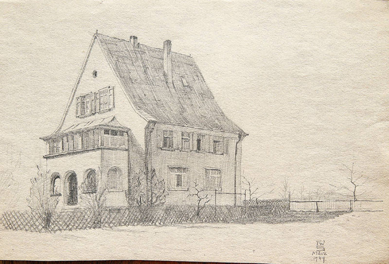 März 1949. Bleistiftskizze des Hauses von Dr.med. Walter Mucha, Gastgeber von Fritz während seines Aufenthalts in Aldingen