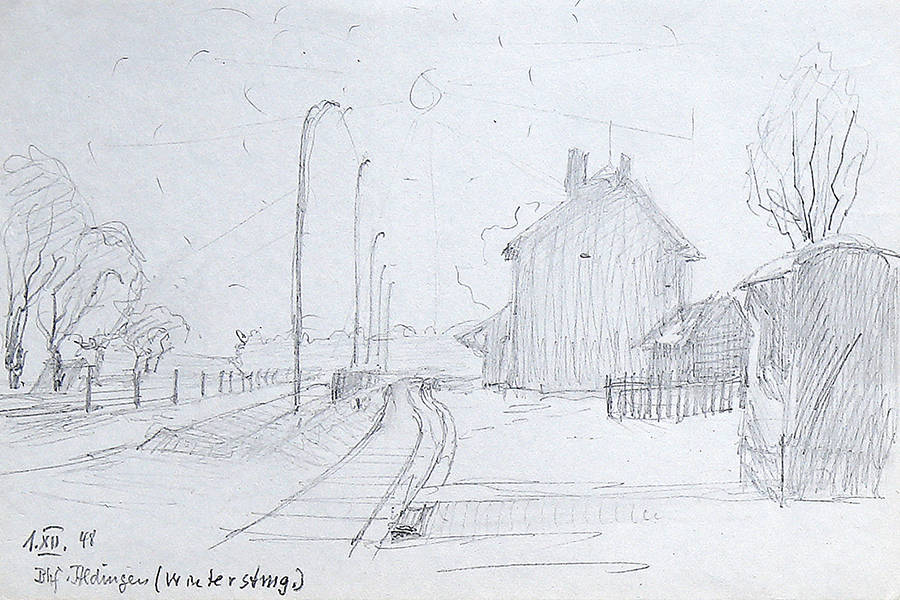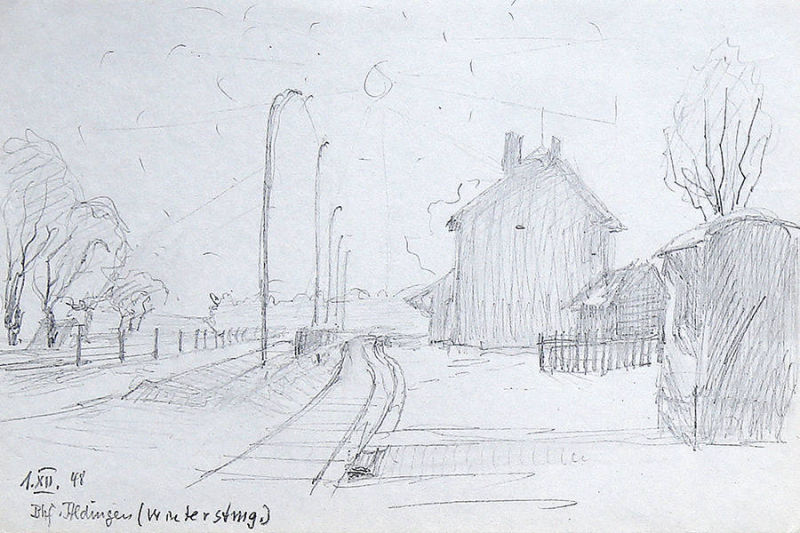 Bleistift Sketch des Bahnhofes in Aldingen, 1.12.1948