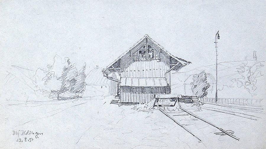 Bleistiftskizze des Bahnhofs in Aldingen, 12.08.1950© Copyright 2022 Hellmut Schulze-Wenck - Alle Rechte vorbehalten