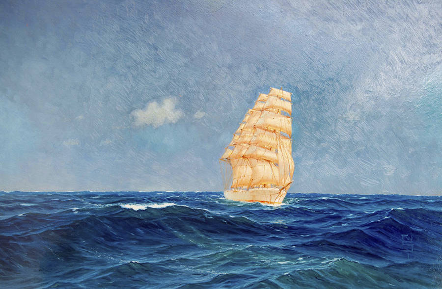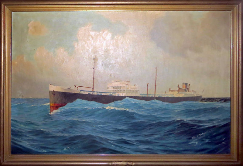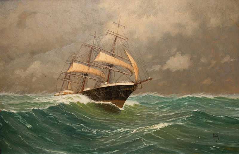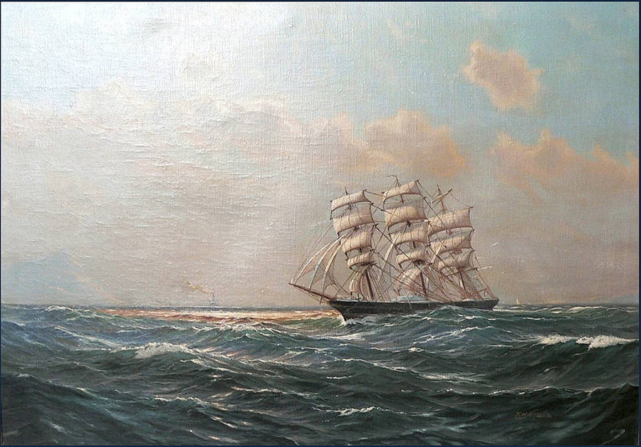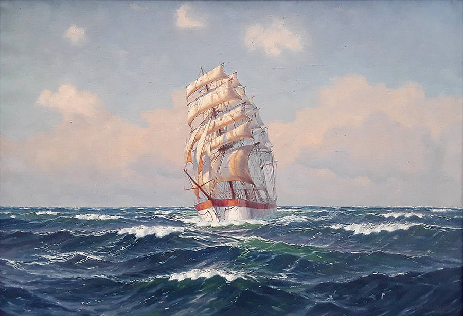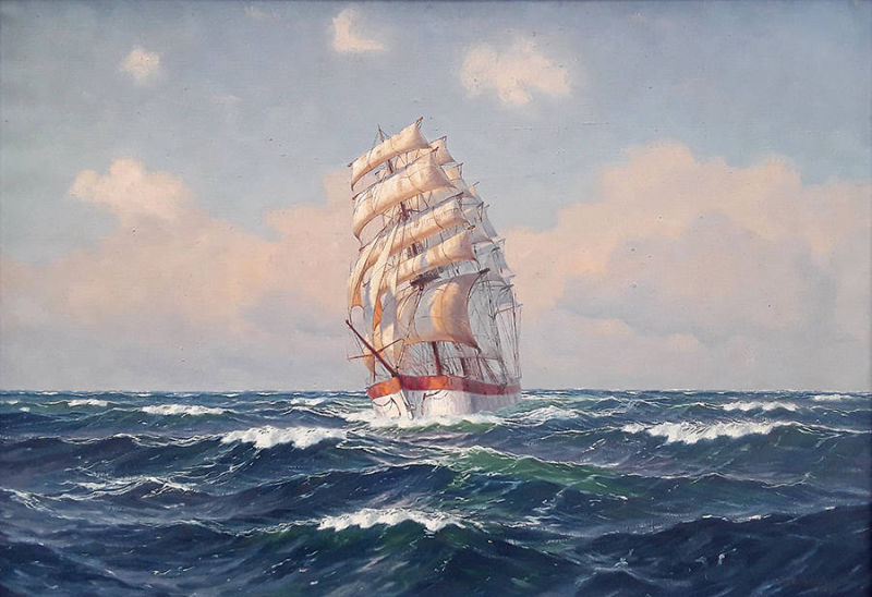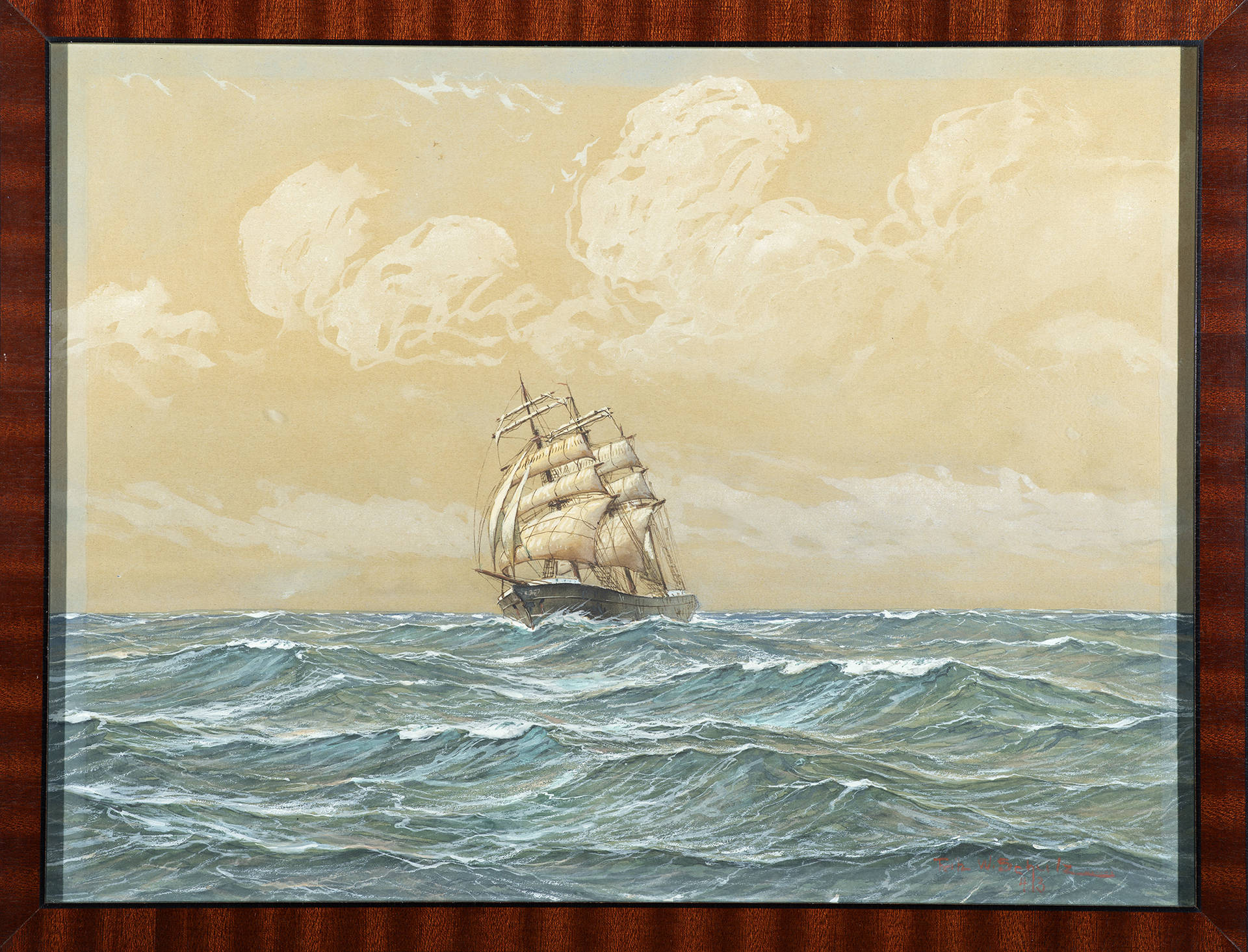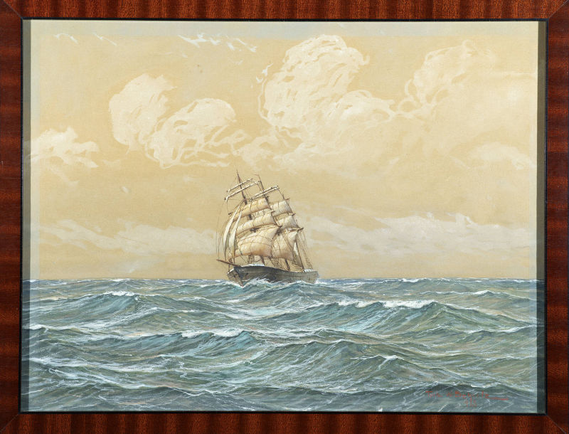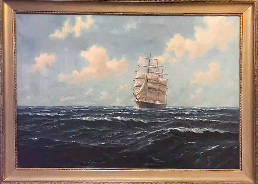 240 Privatbesitz, Frau B. Paulsen in Deutschland. Die Maße des Bildes sind 112 x 86 cm. Auf der Rückseite steht: "14 Knoten Fahrt".