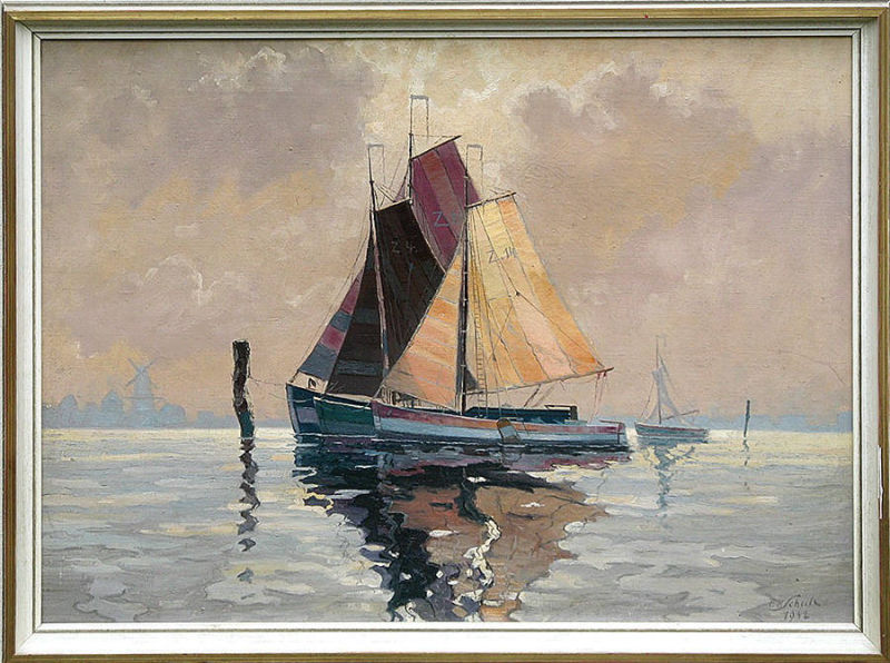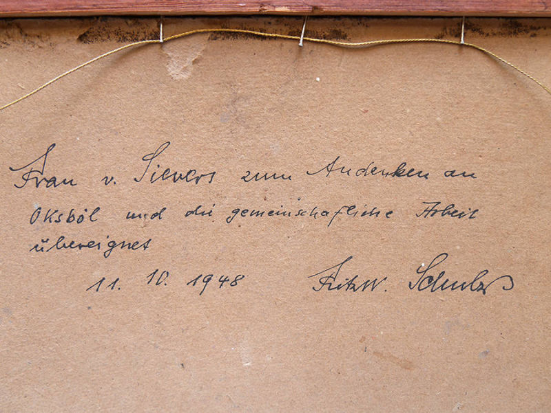 237 Privatbesitz, Dr. von Sivers in Rheinland-Pfalz. Er erbte das Bild von seinem Vater Dr. Gerig, seines Zeichens Zahnarzt, der einst im Lager in Oxböl die Familie von Fritz W. Schulz medizinisch versorgte und das Bild daraufhin als Entlohnung erhielt. Ölgemälde, Größe: 37,5 x 28 cm ohne Rahmen