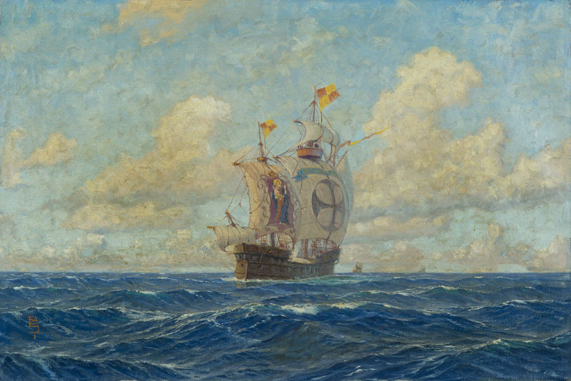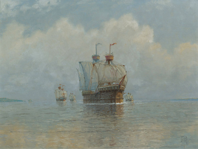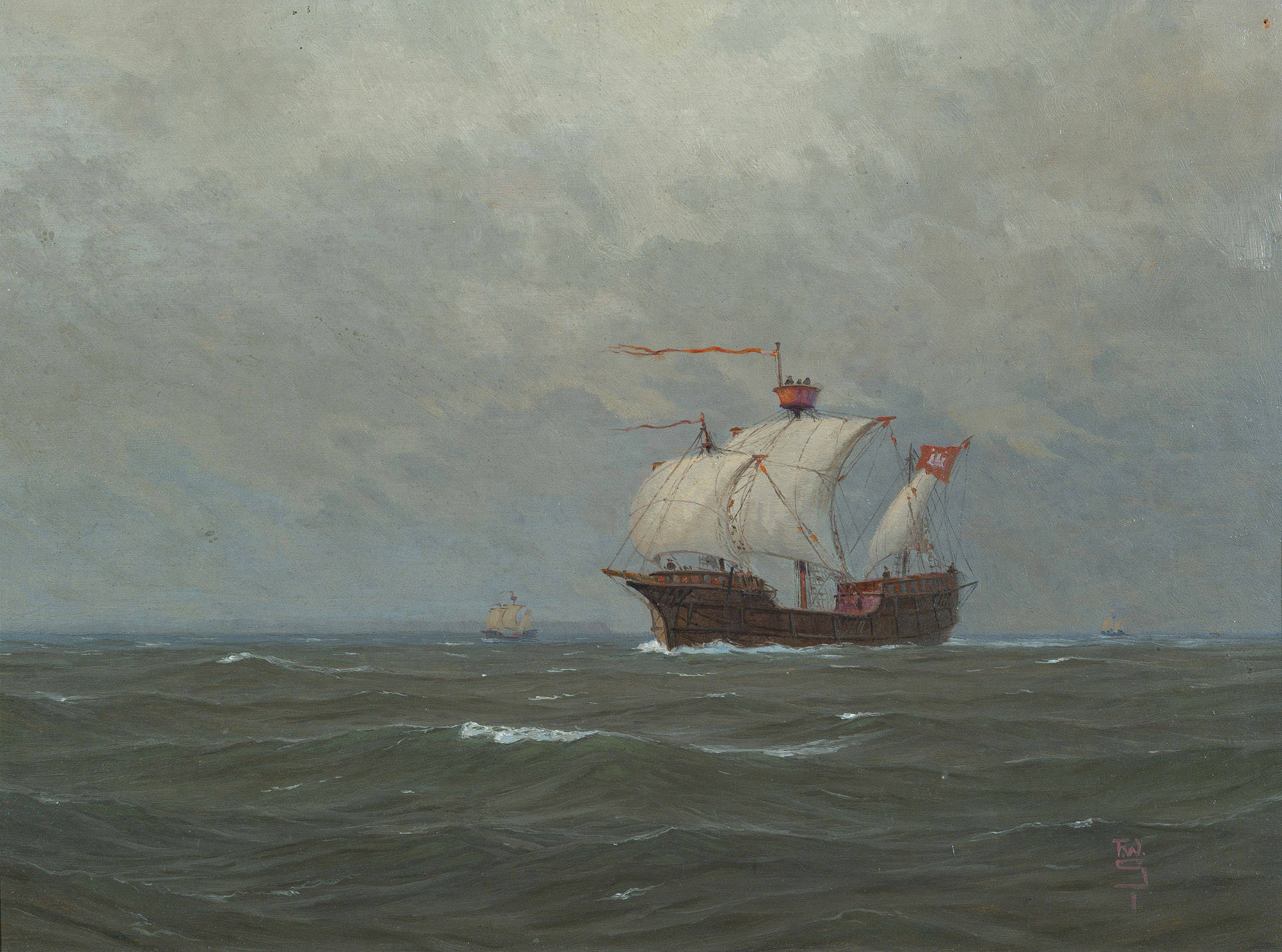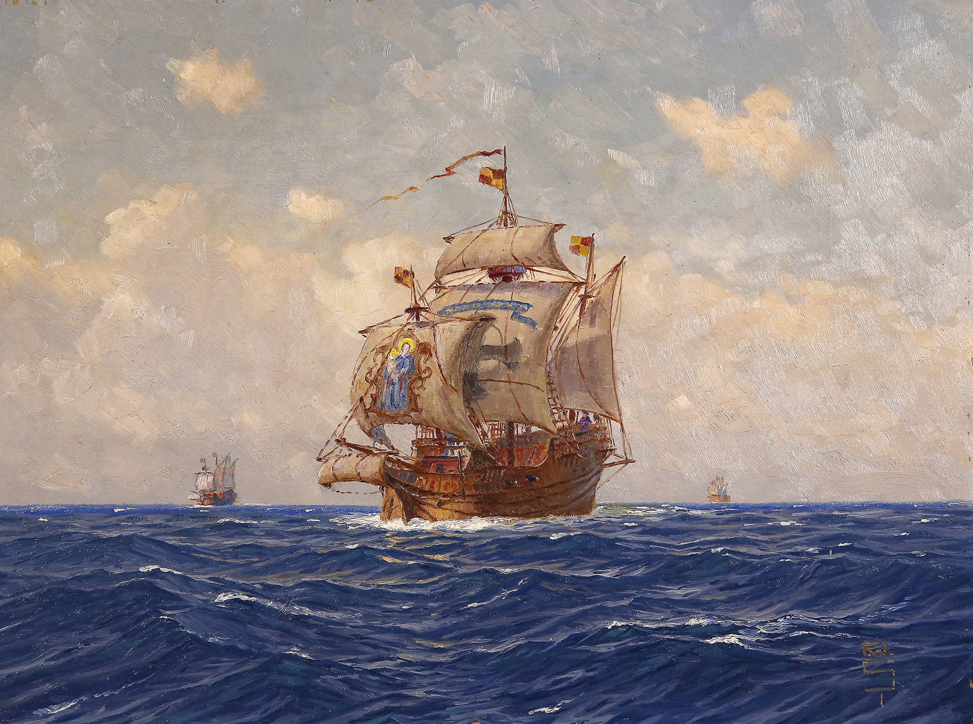 409 Öl auf Hartfaser, 40 x 34 cm, "Die Caravellen des Columbus (1492)"