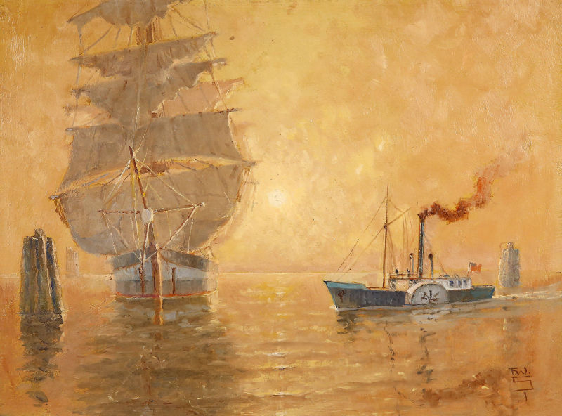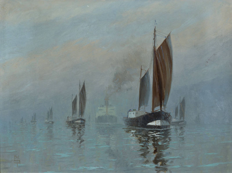 411 Öl auf Hartfaser, 40 x 30 cm, "Morgensonne vor der Themse (Anno 1850)"
