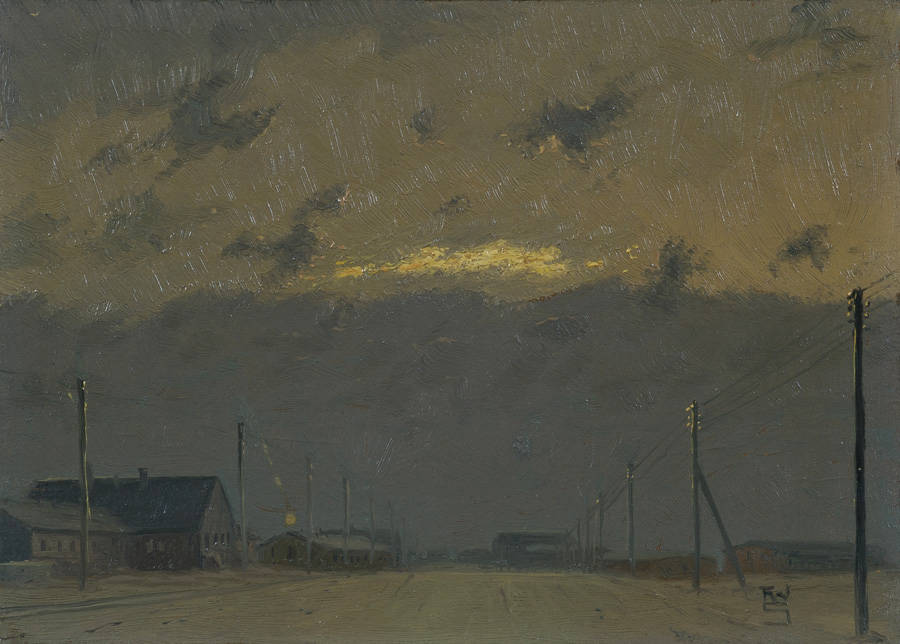 014 Öl auf Hartfaser, 19,5 x 14 cm, 1947, "Lagerstrasse Oksböl (nach einer Geisha-Aufführung)"