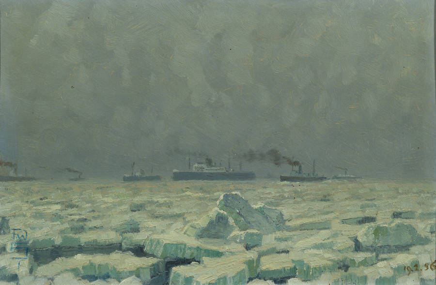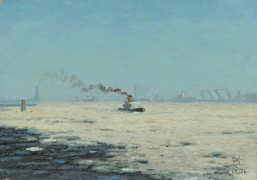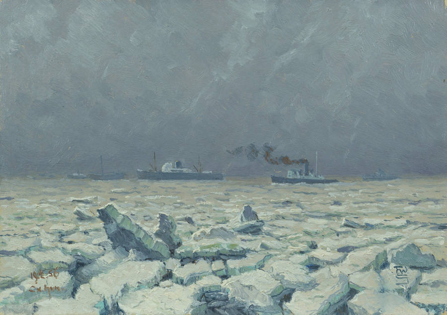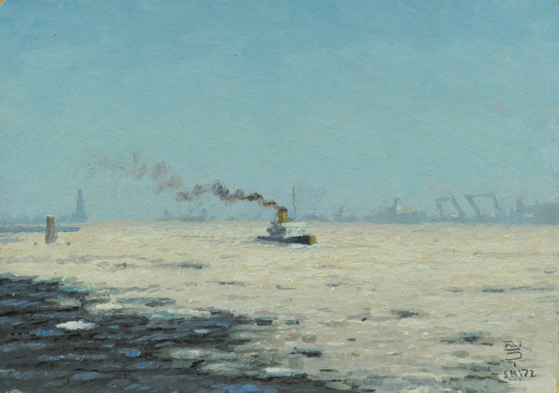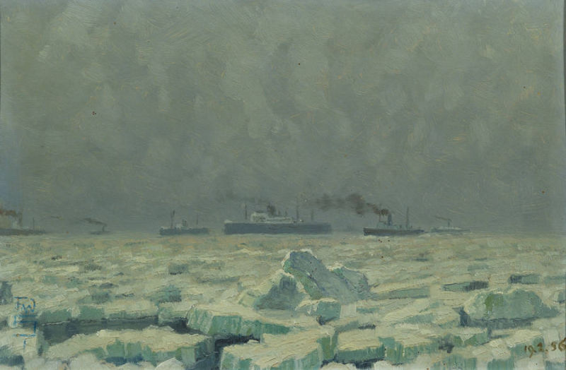 024 Öl auf Karton, 28 x 19,5 cm, 19.02.1956 "Eisgang vor Cuxhaven"
