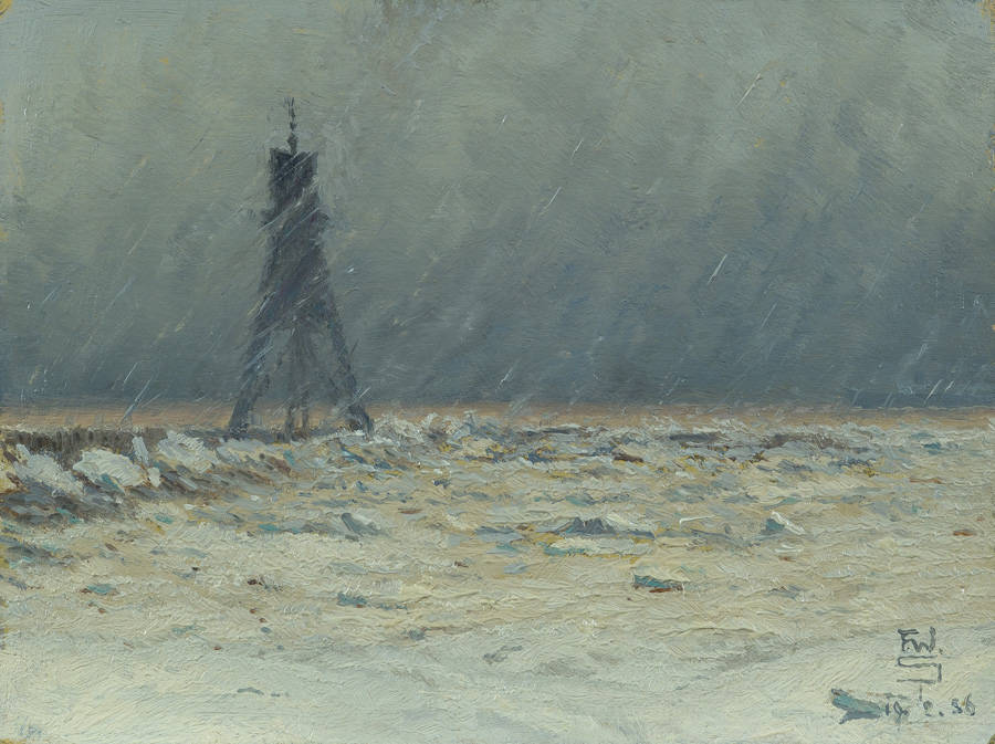 068 Öl auf Hartfaser, 20 x 15 cm, 18.02.1956, "Kugelbake beim Eisgang und Schneewind"