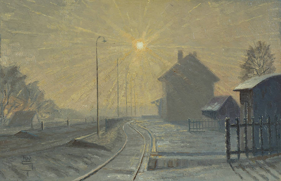 073 Öl auf Hartfaser, 29 x 18,5 cm, 1948, "Bahnhof Aldingen Anfang Dezember 1948"