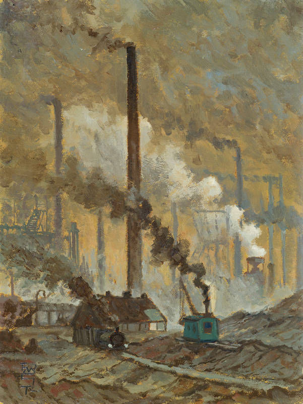 074 Öl auf Hartfaser, 27 x 21 cm, "Grundkomposition! Alles andere nach Format. Nicht so viele Schornsteine"