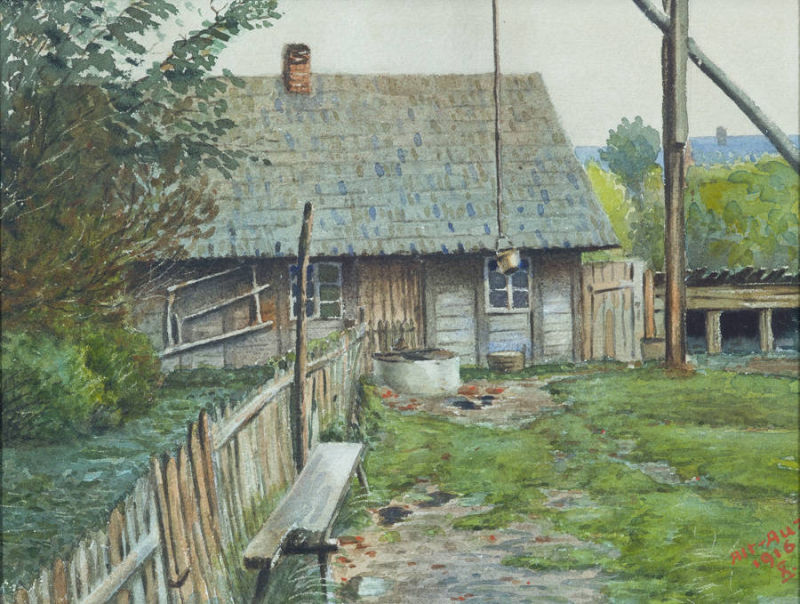 090 Aquarell, 27,5 x 20,5 cm, 1916, eine russische Bauernkate