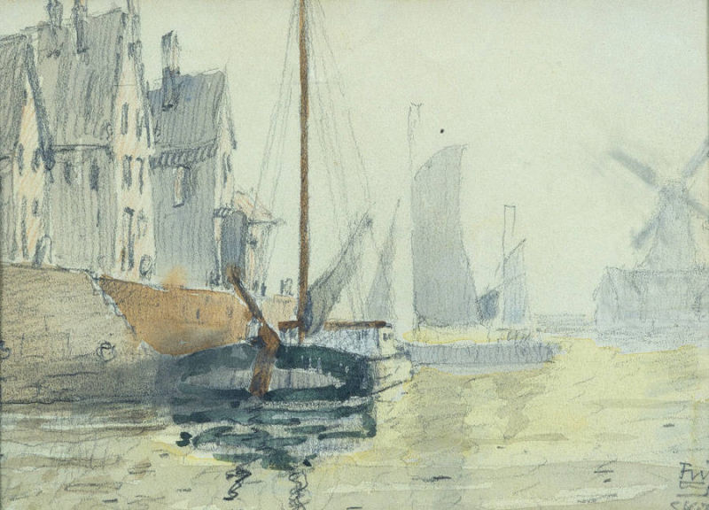 114 Aquarell Skizze, 15 x 11 cm, 1922, "Holländischer Hafen - Abendstimmung"