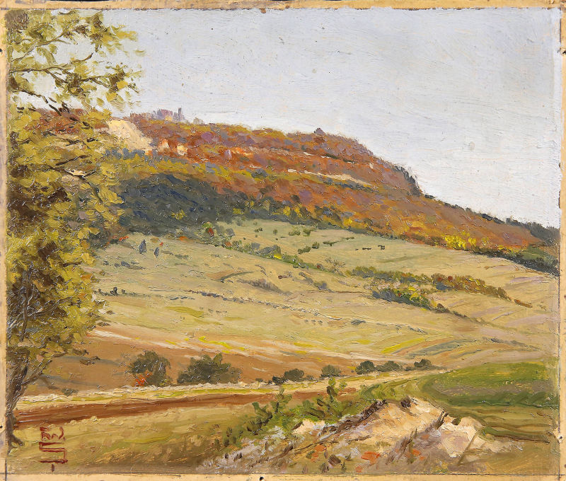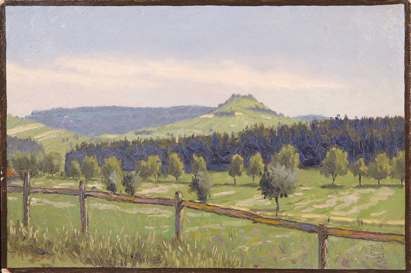 448 Öl auf Pappe, 18 x 15 cm,, "Dreifaltigkeitsberg bei Spaichingen Herbst 1949"